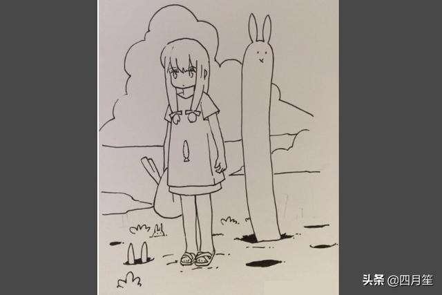 四,画双腿时注意结合衣服的长度,衣服偏长点则大腿露出来的就少一些,小腿要全部画出来,然后添加上拖鞋。画长脖子的小兔子,顺便画一些装饰物,例如大树,草地和调皮的小兔子。