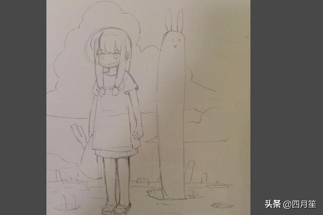 一,确定画的是一个女孩和一个兔子,先定好人物和兔子的高度,当然这是卡通画,所以可以把兔子画的稍微夸张点,脖子画的很长。